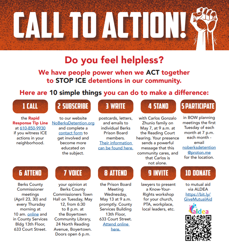 Hosted by the BURN Organizing Workgroup (BOW), we're fighting to get ICE out of Berks entirely – no warehouse prison camps and no voluntary collaboration with ICE. We connected with our neighbors to make sure our local resources aren't being used for the federal government's role.