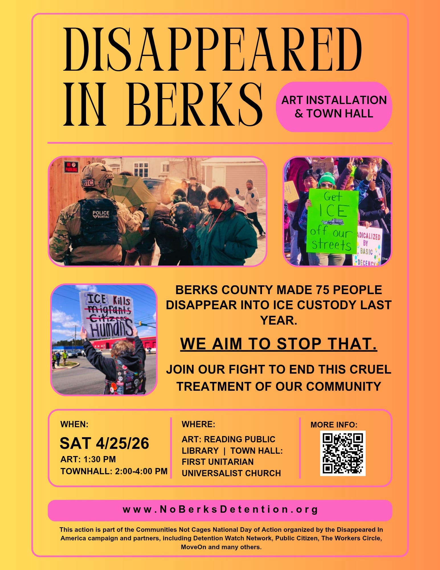 Did you know the county has been quietly moving immigrants from our jail into ICE custody for decades? 75 people – our neighbors – were disappeared in just the past year. We aim to stop that. We want Berks to be a safe, compassionate community, not a pipeline to ICE. We're showing up to stand for dignity, justice, and Constitutional rights for everyone, not just those blessed with American citizenship.